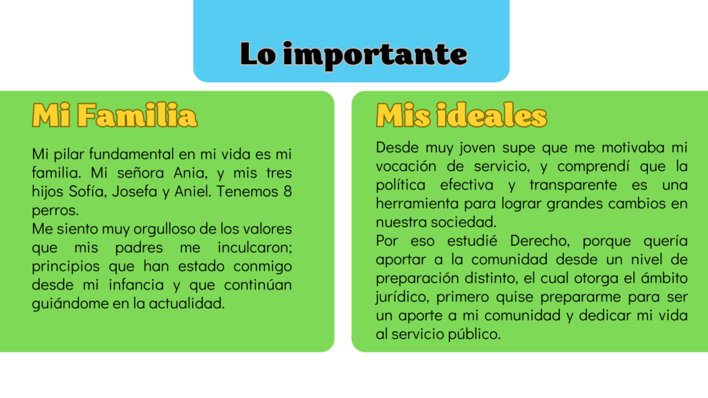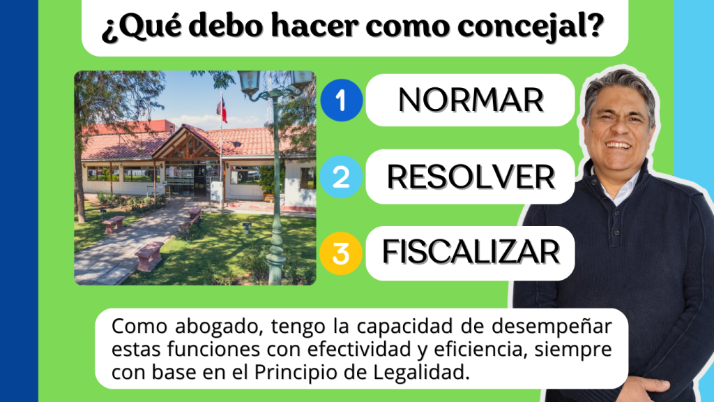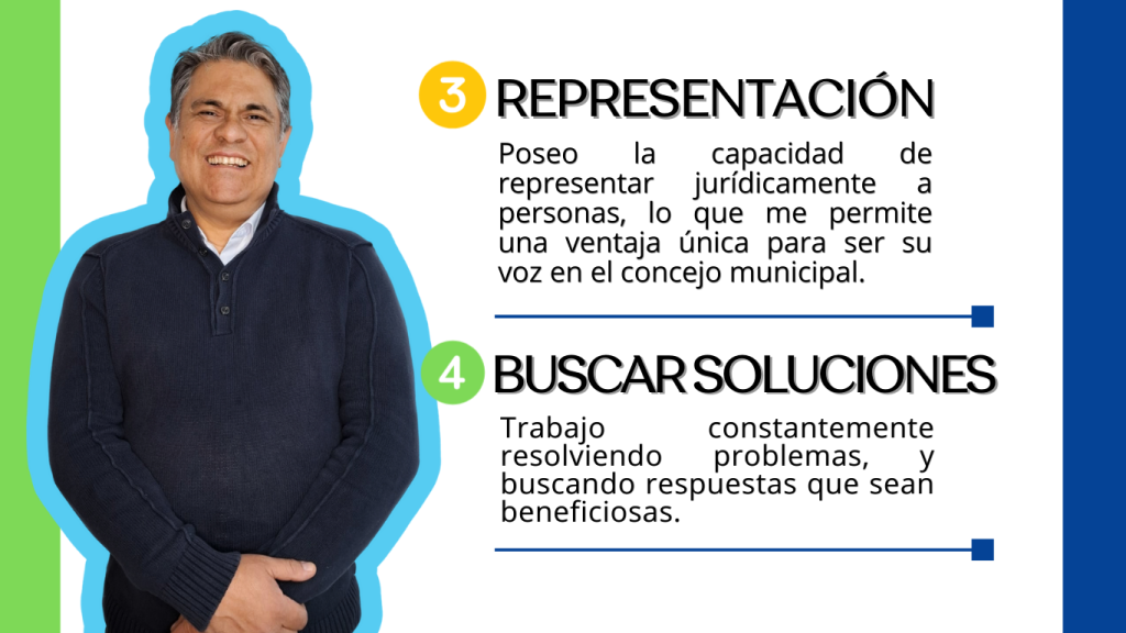 Mi objetivo es que seas representado por un concejal preparado para hacer bien el trabajo y tomar decisiones, defender tus intereses, garantizando una gestión transparente y eficiente. Fiscalizar la gestión municipal, asegurando una correcta administración del presupuesto y evaluar iniciativas que impacten áreas clave como infraestructura, medioambiente, trabajo, seguridad, educación, salud y cultura.